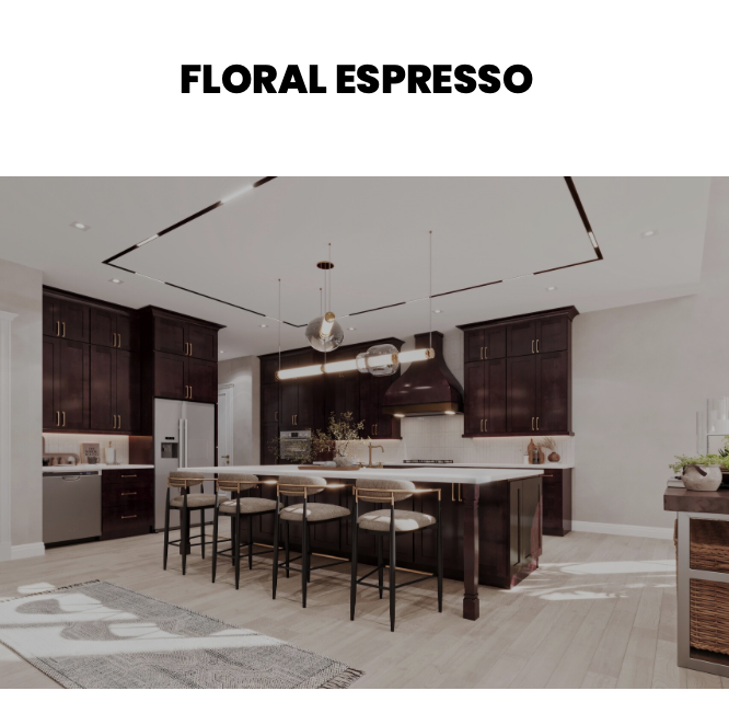 Modern kitchen with dark wood cabinets, a central island with four bar stools, pendant lighting, and minimal decor.