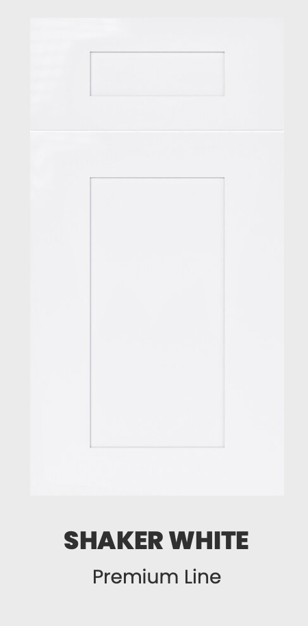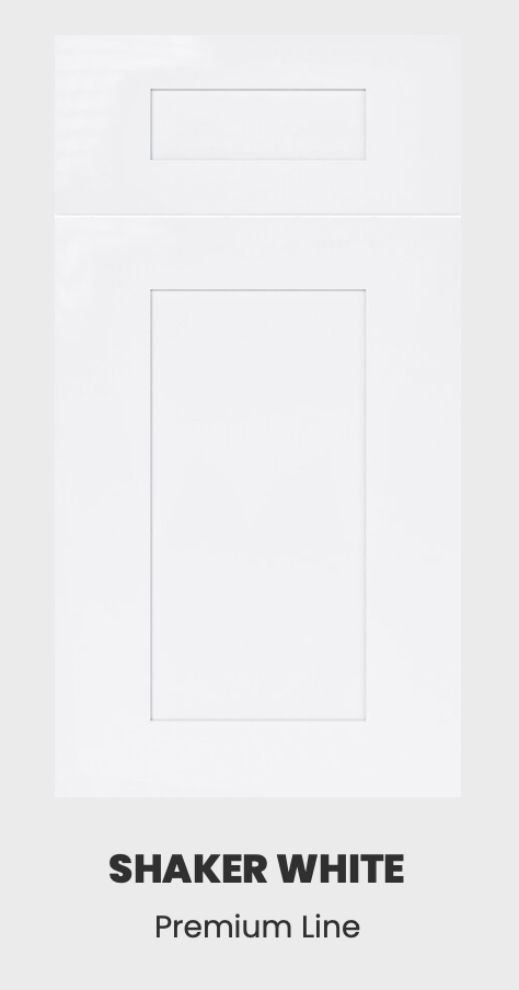 Close-up of a shaker white door with a rectangular upper panel and a larger rectangular lower panel, labeled 'Shaker White Premium Line'.
