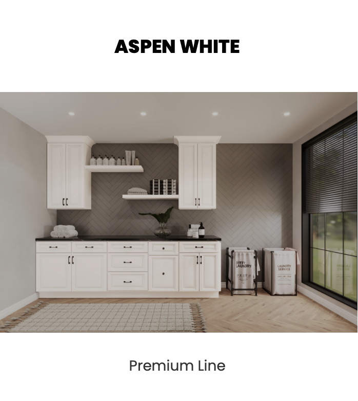 Close-up of a white cabinet door with a rectangular raised panel design, labeled 'Aspen White Premium Line'.