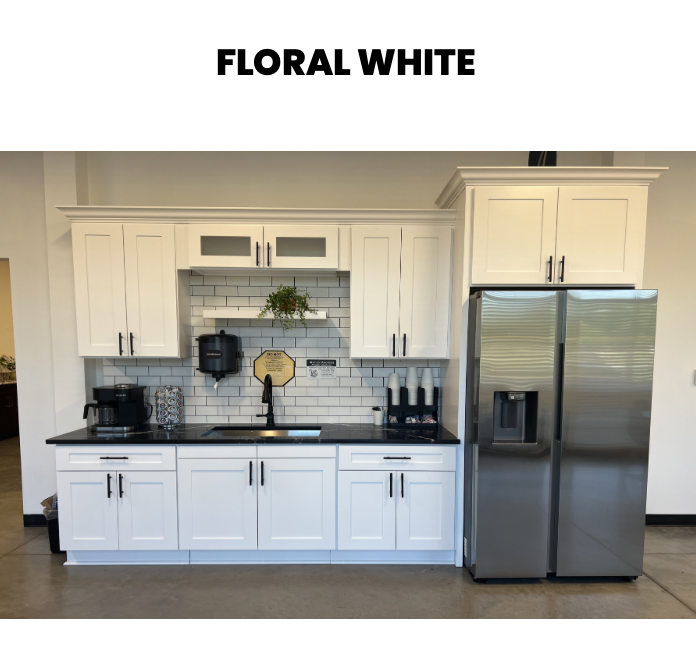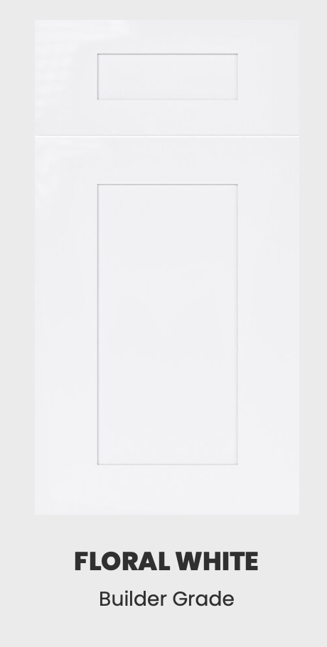 A paint sample card titled 'Floral White' showing a white paint color with a small rectangular swatch at the top. Text indicates the color is 'Builder Grade'.