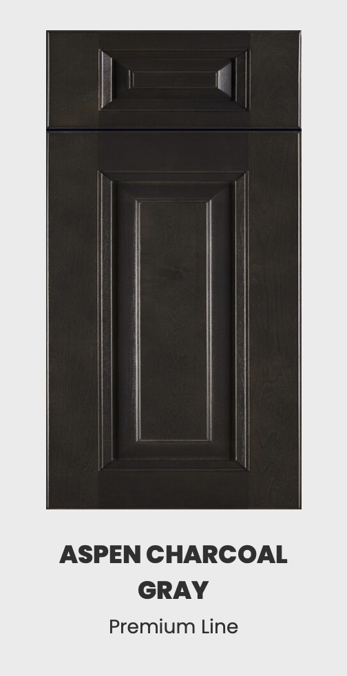 A dark charcoal gray kitchen cabinet with paneled doors, part of the Aspen Charcoal Gray Premium Line.