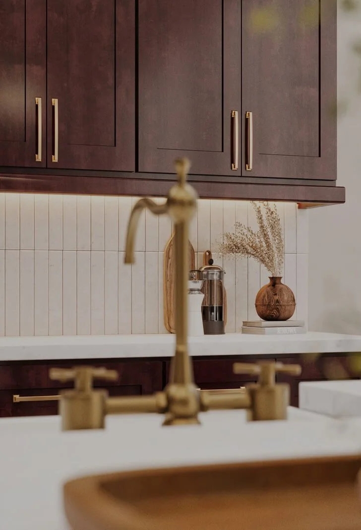 Close-up of a kitchen sink faucet with a kitchen countertop and backsplash in the background. The backsplash has vertical light-colored tiles, and above are dark wood cabinets with gold handles. On the counter, there are decorative items including a