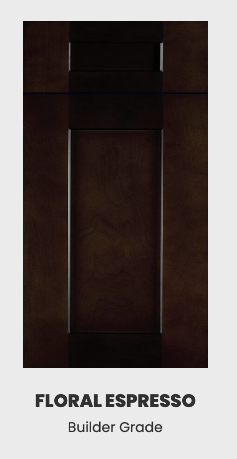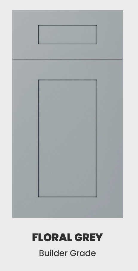 A cabinet door in floral grey builder grade color with a rectangular drawer on top and a larger rectangular panel below.