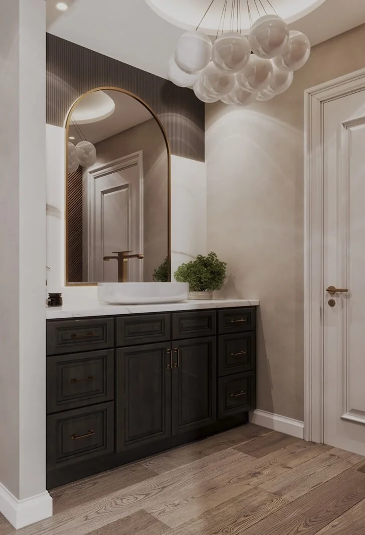 Modern bathroom vanity with a black cabinet, white marble countertop, a vessel sink, and a large mirror in a well-lit room with a chandelier and a potted plant.