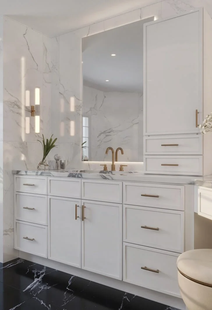 Modern bathroom vanity with white cabinets, gold handles, and a marble countertop and backsplash. There is a large mirror above the sink, a small plant on the counter, and black marble flooring.