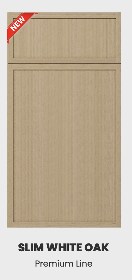 Light wood cabinet door with a small top drawer, labeled 'NEW' in the top left corner, and text indicating it is 'SLIM WHITE OAK Premium Line'.